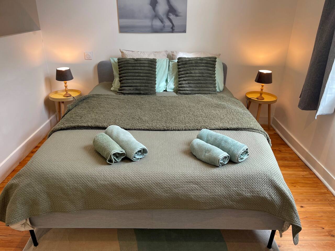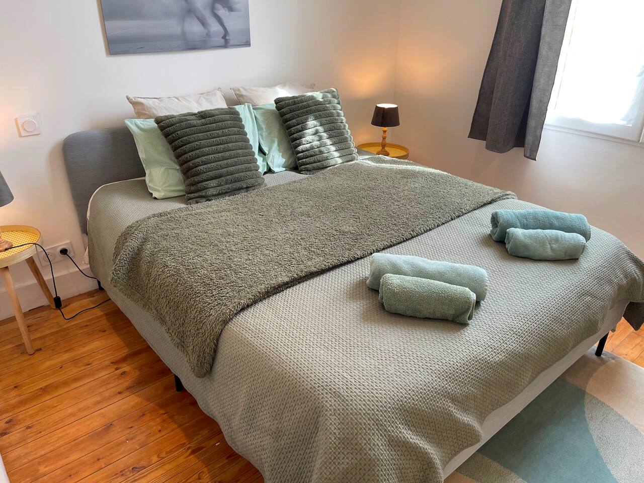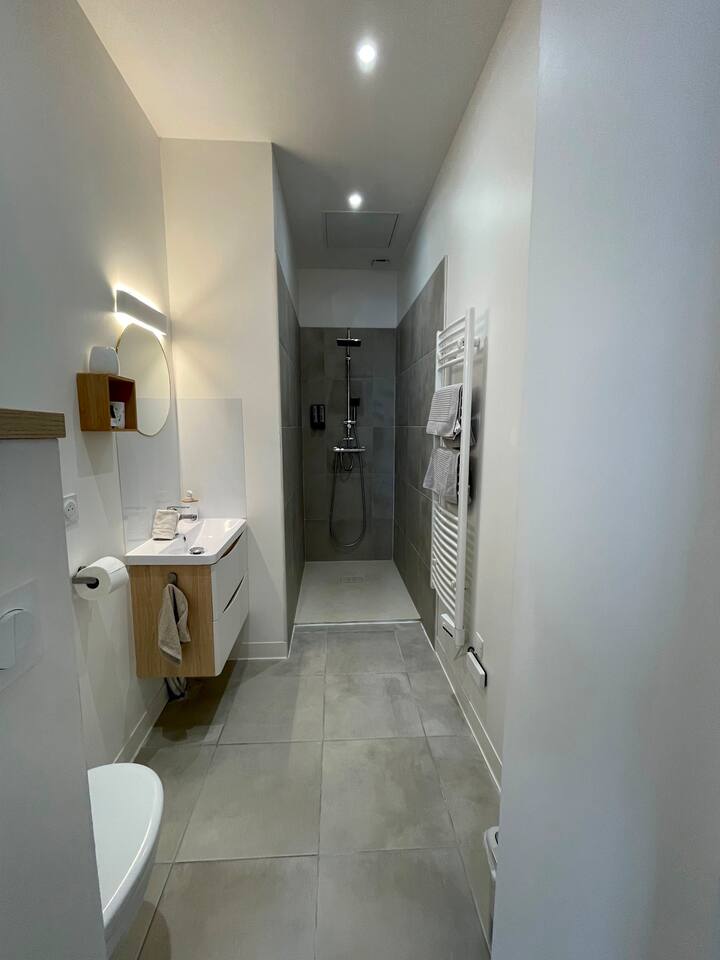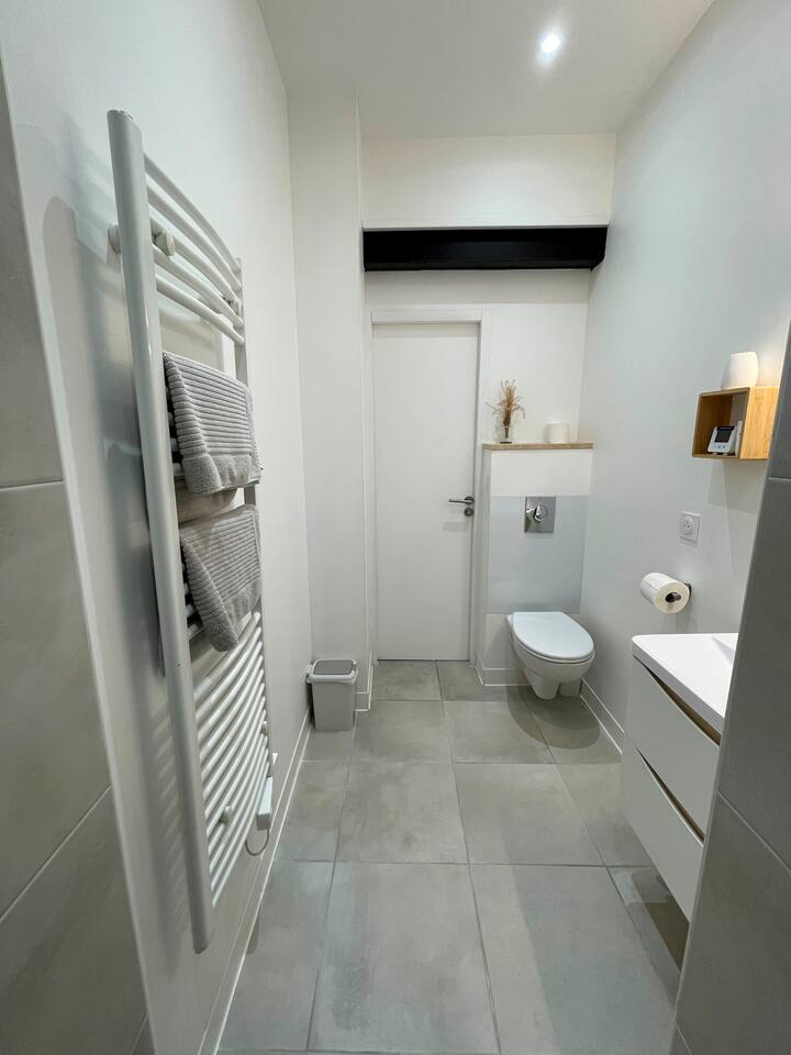 Le logement se compose des pièces suivantes : - Salon/salle à manger (TV connectée, canapé 3 places, coin repas) - Chambre ouverte (lit Queen-size - 160/200) - Espace de travail - Salle de bain (douche à l’italienne) avec WC - Cuisine équipée (plaque à induction, four, micro-ondes, cafetière, essentiels de cuisine, etc.) - Espace dressing et machine à laver Fournitures disponibles : - Draps et linge de lit - Serviettes de bain (2 par personne) - Essentiels de cuisine (huile, sel & poivre...) - Cafés, thés, sucre/confiseries - Produit d’entretien de base (lessive, liquide vaisselle, torchons, chiffons, etc.) - Shampoing, gel douche & savon pour les mains Autres avantages : - Un lit bébé (lit parapluie avec draps) est disponible gratuitement sur demande - Possibilité de stocker 2 vélos au bout du couloir - Abonnement Netflix inclus ainsi qu’un large choix de chaînes TV De plus, vous pouvez aussi louer l’appartement du rez-de-chaussée (Harmony) si disponible afin de privatiser l’immeuble.